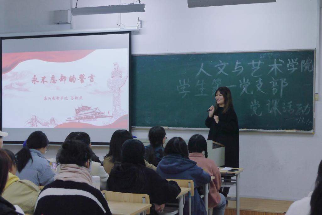 为提高我院学生党员的觉悟修养,11月10日晚上18:30,亚洲成av无码亚洲人思政教师苏敏燕老师为本院学生支部上了一节主题为“永不忘却的誓言”的党课。