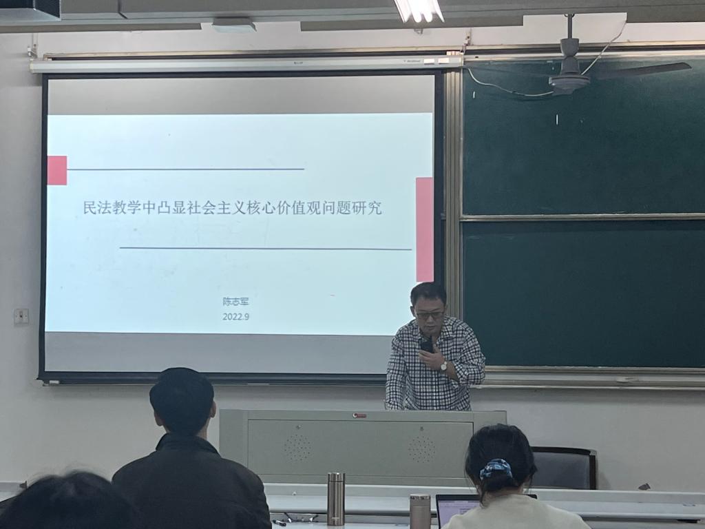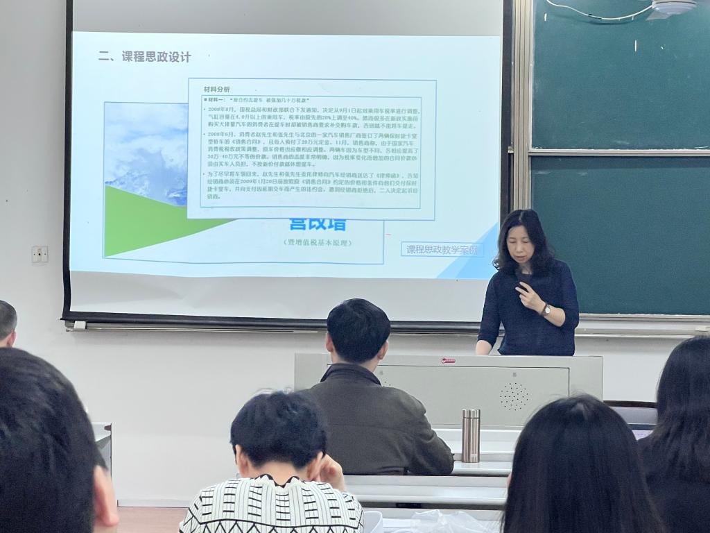 陈颖老师以《税法课程思政中的融合问题与对策研究》为例,从设定融合目标、确定融合内容、探寻融合路径、制定融合考核标准四个方面介绍了税法课程中如何将思政元素“融盐于水“般有机融入教学设计和实践中。陈志军老师以《民法教学中凸显社会主义核心价值观问题研究》为例,结合典型教学案例,分享了民法教学与社会主义核心价值观的融合方法,展望课程思政未来发展。两位老师分享结束后,老师们针对课程建设过程中教学设计、教学方式、评价体系等问题积极发言、提问,气氛非常活跃。