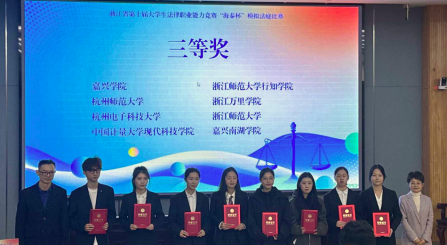 在法律职业能力竞赛方面,学院组织法学学子参加浙江省第十届大学生法律职业能力竞赛的演讲类比赛和模拟审判比赛。经过激烈角逐,共获得演讲类比赛一等奖1个、二等奖2个和三等奖1个的好成绩,获得奖项层次和数量为近十年最高。欣喜的是,模拟审判比赛系我校首次参加该类比赛,经过指导老师训练、专业层面训练、聘请法官担任评委进行校内初赛、决赛等环节的精心准备,我校法学学子初次参赛即取得省三等奖的历史性突破。作为一个转设不足三年的高校法学专业,在模拟审判比赛中,能与杭州电子科技大学、杭州师范大学、浙江师范大学等国内知名高校参赛队并肩领奖,实属不易。