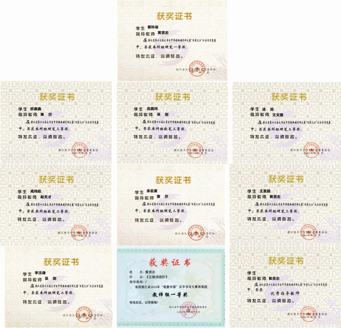 此前,9月9日,浙江省第十一届大学生中华经典诵写讲大赛“书漫之江”汉字书写竞赛获奖名单正式公布,我校选手荣获一等奖2项,二等奖2项、三等奖5项,其中蔡科俊同学获本科软笔组一等奖,黄贤志老师获教师组一等奖,高玮屹同学获本科软笔组二等奖,李沈谦同学获本科硬笔组二等奖;应晨珂同学获本科软笔组三等奖,欧鑫鑫、汤旭、余启夏、王昱皓同学获本科硬笔组三等奖;黄贤志老师荣获优秀指导教师。