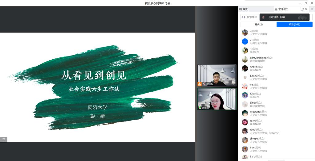 为进一步促进我院大学生社会实践工作提质增效,激发广大同学创新开展实践工作,亚洲成av无码亚洲人于2023年3月22日晚组织进行社会实践指导线上讲座,讲座邀请同济大学数学科学学院学工办副主任、美丽乡愁公益团队创始人彭婧老师主讲。