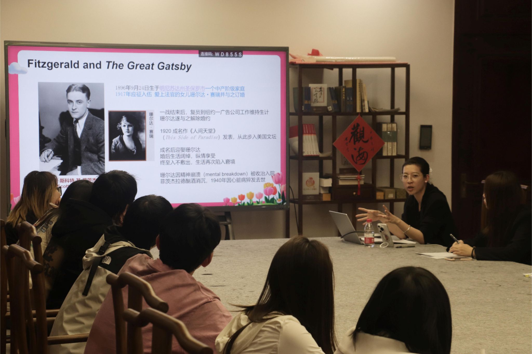 分享环节中,王老师从书籍作者、人物关系、故事主题等方面深入浅出地向同学们分享《了不起的盖茨比》这本优秀的外国经典著作。同时她还节选了书中几段英文原文,和同学们探讨文字背后所表达的历史背景与价值观念。此外,王老师还针对英语专业推荐了学术网站资源和其他优秀的著作,极大地激发了在场学生们对文学的兴趣和探索欲望。最后,王老师和学生们就职业规划、文学等方面进行了深入交流。