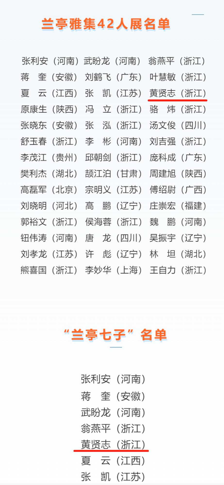 3月14日至16日,由中共浙江省委宣传部、浙江省文联、绍兴市人民政府联合主办的第六届中国书坛兰亭雅集42人展、“兰亭七子”评审工作在绍兴举行。经过三个阶段的评审,我院黄贤志老师同时入选兰亭雅集42人展名单和“兰亭七子”名单。