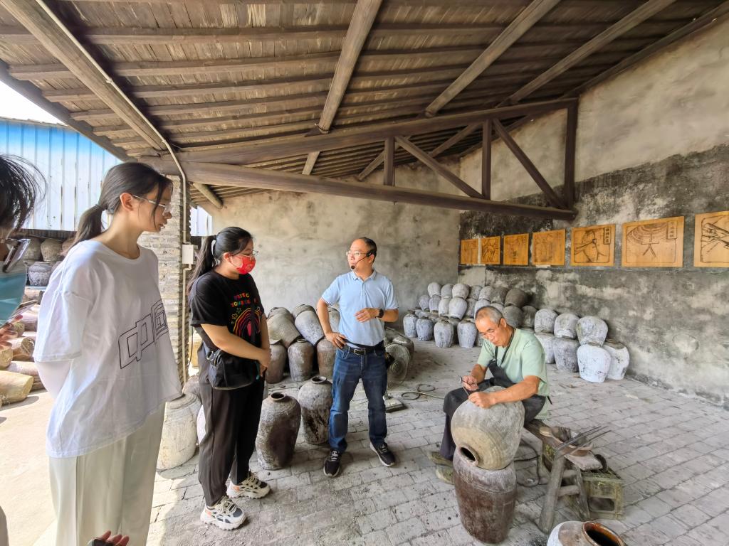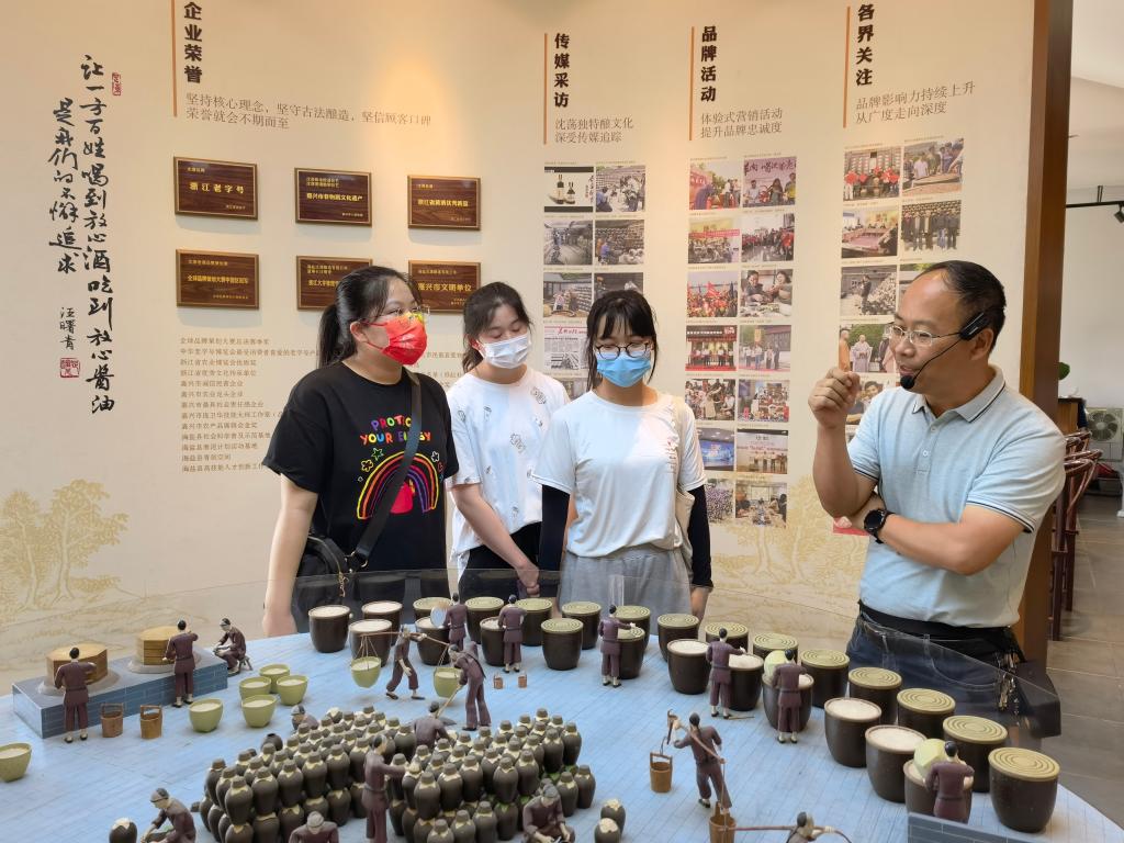 在调研过程中,同学们详细了解了沈荡酿造黄酒以及酱油的工序,亲眼见证了修缸师傅黄建根修补有裂缝的酒坛子全过程,深刻感受到技师们怀揣坚定初心、传承地方非遗技艺的匠心精神。