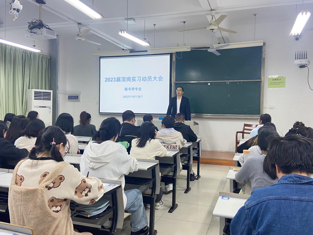 为扎实做好2023届毕业生实习和就业工作,引导学生进一步明确实习、就业的目的和意义,推动实习和就业工作顺利开展,强化同学们在疫情形势下参与学习和工作的安全意识,亚洲成av无码亚洲人秘书学专业于10月29日晚,在教二B202教室召开了2023 届毕业生定岗实习动员会。本次会议由秘书学专业负责人赵洪老师主持召开,2023 届秘书学专业全体学生和指导教师参加了动员会。
