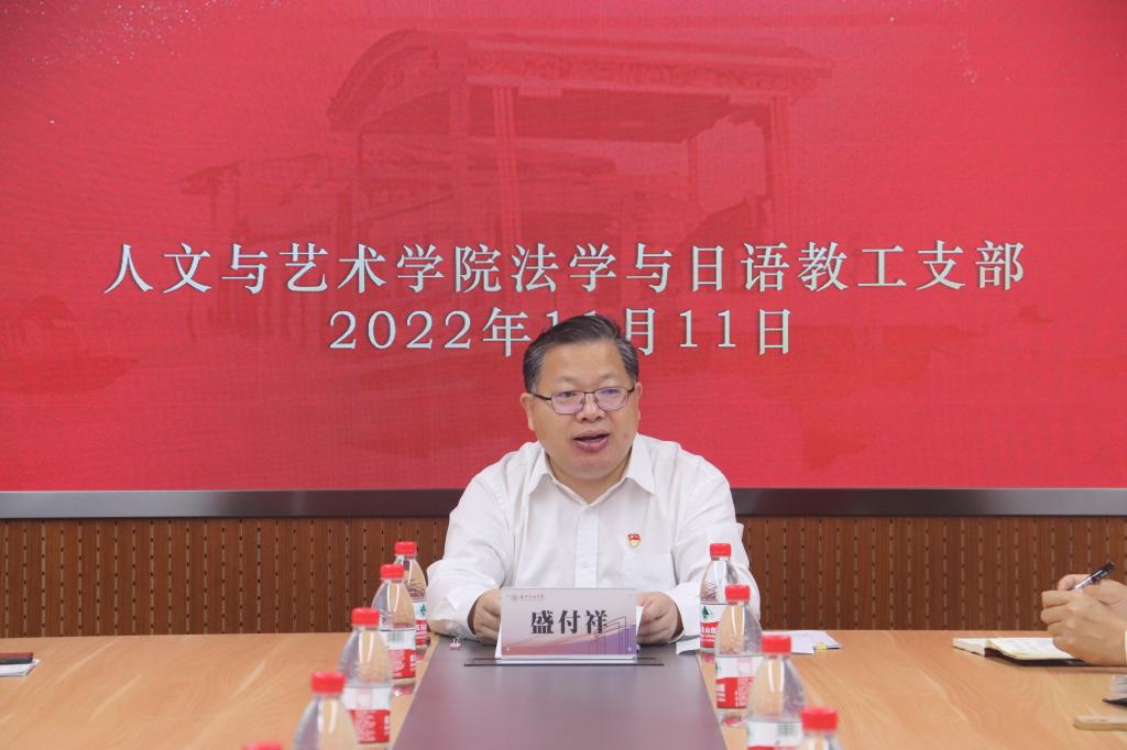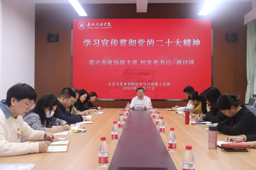 为深入学习宣传贯彻党的二十大精神,2022年11月11日上午,亚洲成av无码亚洲人法学与日语教工党支部在101会议室举行专题宣讲学习会。支部全体党员教师参会,嘉兴市政协副主席、校党委书记盛付祥出席会议并做专题宣讲,宣讲会由支部书记吴海燕主持。