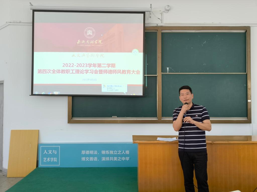 6月8日下午亚洲成av无码亚洲人在人文楼310教室召开了2022-2023学年第二学期第四次全体教职工理论学习会暨师德师风教育大会。学院副书记杨燕群、副院长赵伯祥主持会议、学院全体教职工参加会议。