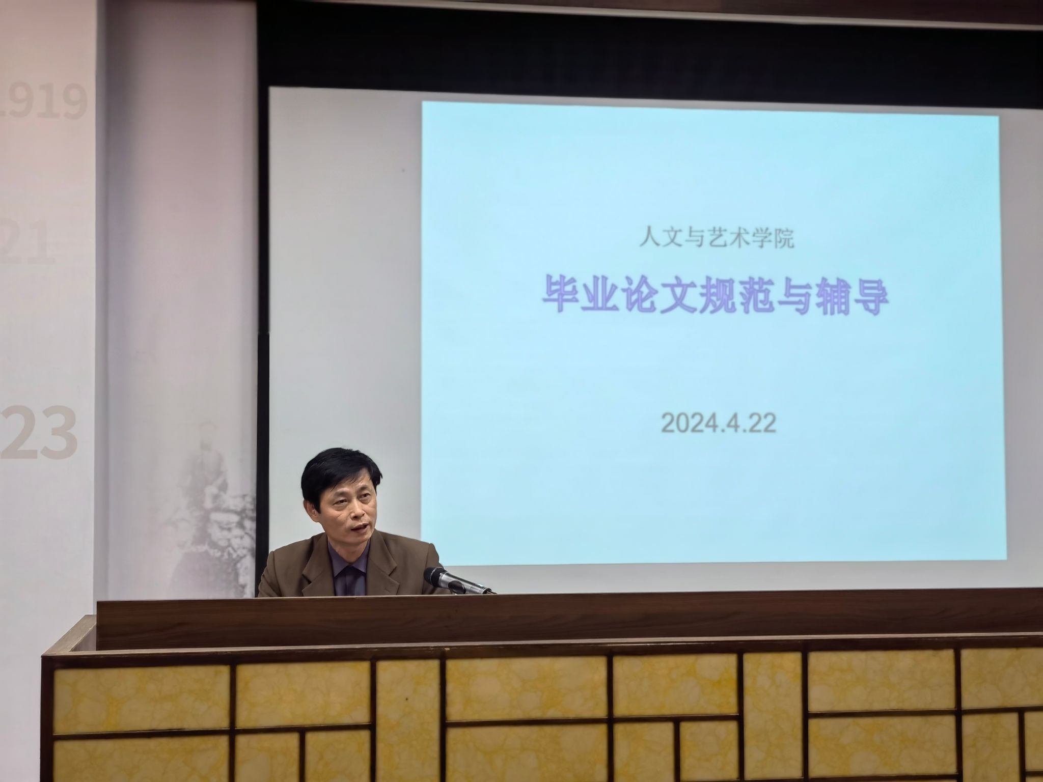 为迎接教育部本科教学合格评估,进一步做好2024届毕业生毕业论文指导工作,4月22日,学院在图书馆一楼报告厅召开毕业论文指导培训会。本次培训会是学院深入开展“教学质量提升年”系列活动之一。学院党政领导班子成员、全体专任教师参加会议。会议由学院党委书记王晨主持。