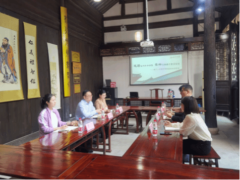 王晨介绍了我院基本情况,并以“破解家风传承难题,推动文旅融合繁荣发展”为主题详细介绍了乡贤与家风研究院的相关科研成果,肯定了沈荡镇对钱氏家风文化的保护与发扬,并结合沈荡镇发展从人文经济学的角度作出思考。他指出,人文经济学是经济发展和文化繁荣相融合的新发展观。沈荡镇有丰富的产业和业态,如钱氏宗祠、百年酒厂沈荡酿造、胜利饭店(余华文学地图)等一批特色文旅资源,未来双方可以进一步合作,以党建为龙头,以项目为纽带,围绕乡贤与家风、红色研学点等资源,深耕家风研究,以文化带动经济发展,进一步满足当地和游客的文化体验。